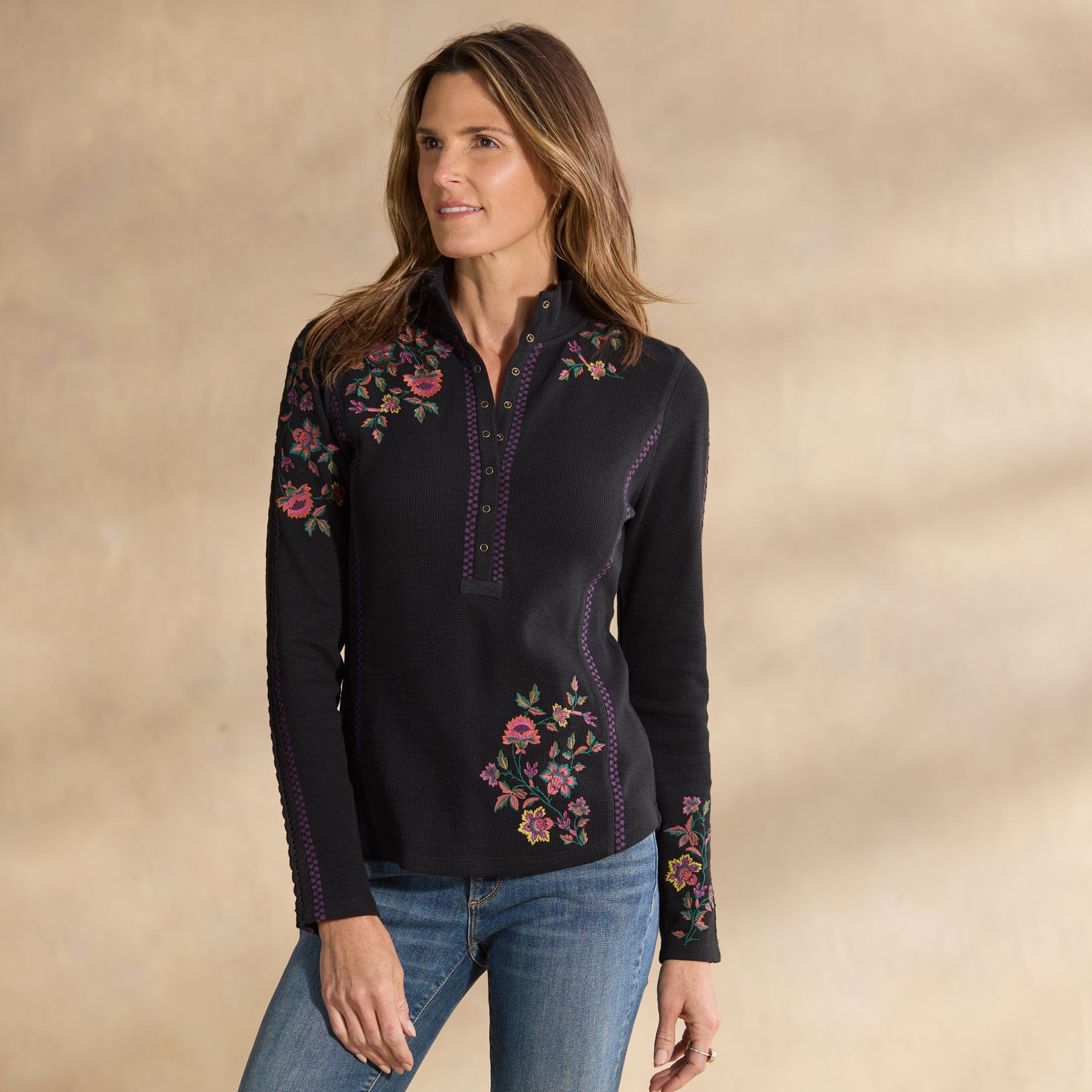 So flattering. our mock neck henley is blooming with stunning. multi colored floral embroidery. feminine lace insets at the sleeves and metal snaps at the placket. Princess seams. Cotton. Machine wash. Imported. Exclusive. Sizes XS (0?C2). S (4?C6). M (8?C10). L (12?C14). XL (16?C18). XXL (20?C22). Approx. 25l.