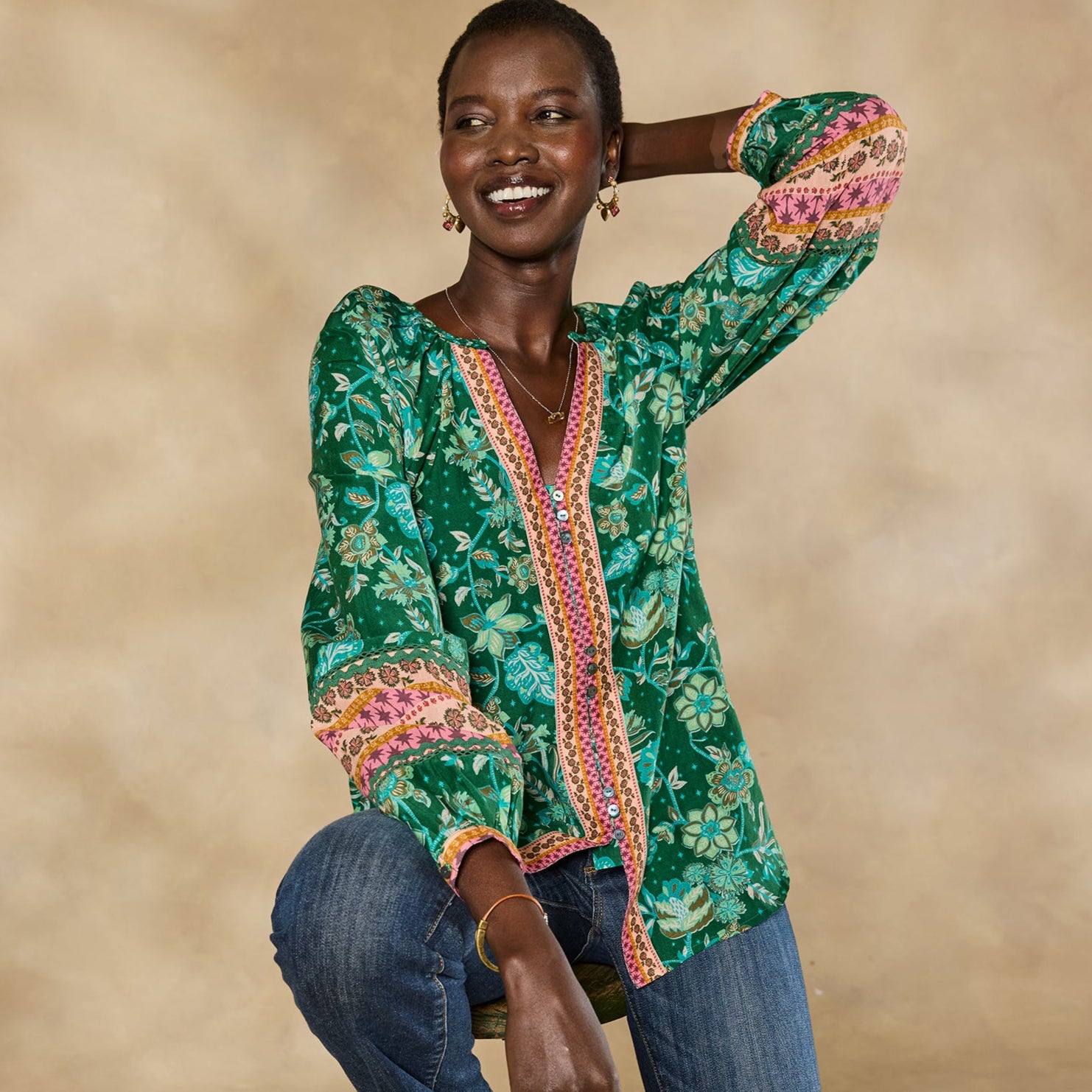 Opulent florals and elegant border prints combine to intoxicating effect. Sleek. body-skimming fit with flattering V-neck and three trios of delicate buttons. Cotton/silk. Machine wash. Imported. Exclusive. Sizes XS (0?C2). S (4?C6). M (8?C10). L (12?C14). XL (16?C18). XXL (20?C22). Approx. 26.5l.