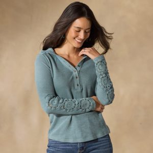 What do you get when you cross your favorite layering henley with your go-to lightweight hoodie? Introducing Caitlin. the most marvelous multi-tasker of the season—with tonal crochet details on the hood and sleeves. flattering seaming. a modern raw-edged placket and delicate henley buttons on an open V-neck. Cotton. Machine wash. Imported. Sizes XS (0–2). S (4–6). M (8–10). L (12–14). XL (16–18). XXL (20–22). Approx. 25l.