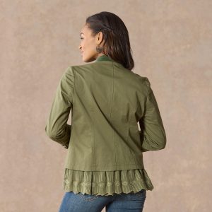 Contrasting velvet trim at the collar and welt pockets lends beauty to our fully lined jacket with ruffle and embroidery detail at the hem and sleeves. Filigree buttons. Cotton/spandex. Machine wash. Imported. Exclusive. Sizes XS (0?C2). S (4?C6). M (8?C10). L (12?C14). XL (16?C18). XXL (20?C22). Approx. 22l.