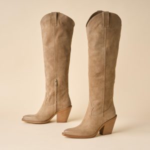 These luxurious boots with a tulip opening hit just below the knee and the soft leather can be scrunched if the wearer desires. Includes an inside ankle zip and side tabs for ease in pulling on and off. Leather or suede. Italy. Exclusive. Euro whole sizes 36–42. 36 (US 6). 37 (US 7). 38 (US 8). 39 (US 9). 40 (US 9.5). 41 (US 10). 42 (US 11). Approx. 3.25 heel.