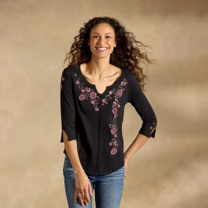 Lush floral embroidery blooms across our Cuyamaca top with raw-edge details. novelty notch neckline and flattering princess seams. Elbow length sleeves. Cotton. Machine wash. Imported. Exclusive. Sizes XXS (00). XS (0?C2). S (4?C6). M (8?C10). L (12?C14). XL (16?C18). Approx. 22l.