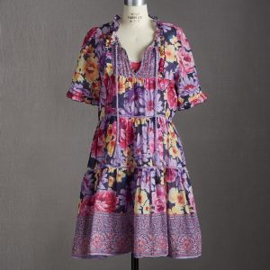 Artistic florals printed in painterly style bloom in vibrant colors on our V-neck popover dress with border print detail throughout. Feminine ruffles. tiers. pintucks and ladder lace lend extra beauty and grace. Tassel ties. Cotton. Hand wash. Imported. Exclusive. Sizes XS (0-2). S (4-6). M (8-10). L (12-14). XL (16-18). XXL (20-22). Approx. 38.5l.