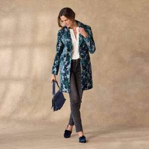 Beauty in velveteen. our tapestry inspired jacquard coat features a stylish lining inspired by the best of menswear. novelty lapel. two welt pockets and a center back vent. Polyester. Dry clean. Imported. Exclusive. Sizes XXS (00). XS (0–2). S (4–6). M (8–10). L (12–14). XL (16–18). Approx. 34.5l.
