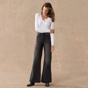 Stretchy. five-pocket styling with dramatic wide legs that grace the ankles. Cotton/spandex. Machine wash. Imported. Sundance exclusive. Sizes 24–32. 30. 32 or 34 inseam. 11 rise. 26 leg opening.