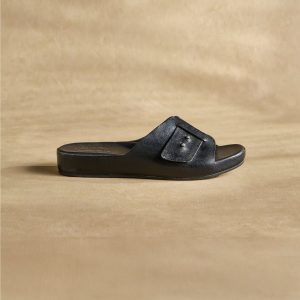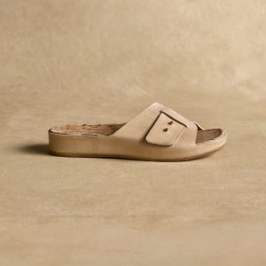 Go in comfort and style in these vegetable-tanned leather sandals with unique slip-through design straps and metal stud accents. Cork or rubber socks. rubber soles. Handcrafted. Imported. Whole sizes 6?C11. 1 heel.