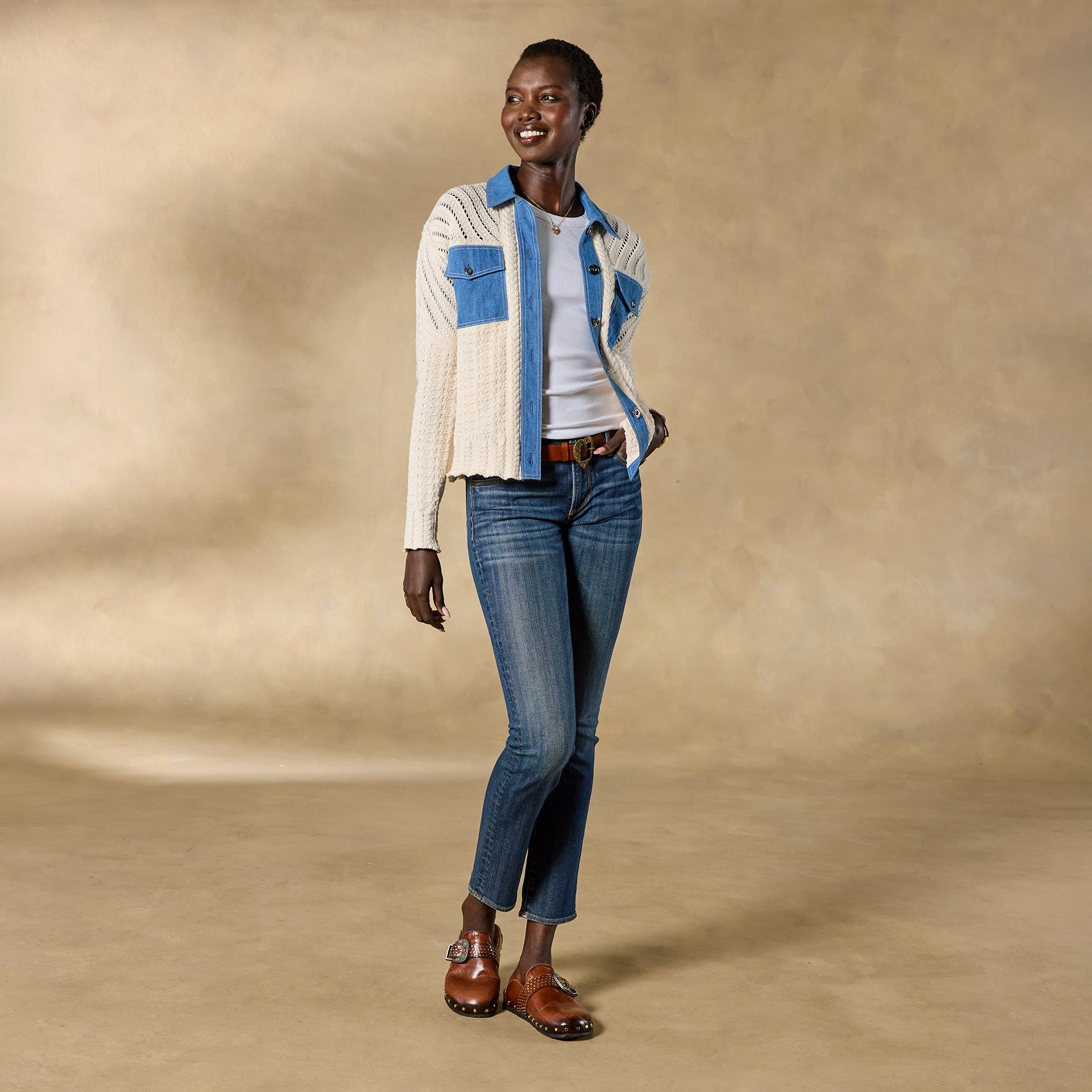 When you can’t decide between a cardigan and a denim jacket. reach for the Mesquite. This stylish mixed-media topper offers the best of both worlds. blending a super-soft sweater with denim accents. Cotton. Hand wash. Imported. Exclusive. Sizes XS (0?C2). S (4?C6). M (8?C10). L (12?C14). XL (16?C18). XXL (20?C22). Approx. 21l.