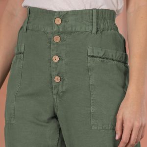 Easy. button fly pants with elastic back. Ladder lace detail. Linen/cotton. Machine wash. Imported. Exclusive. Sizes 2 to 16. 28 inseam.
