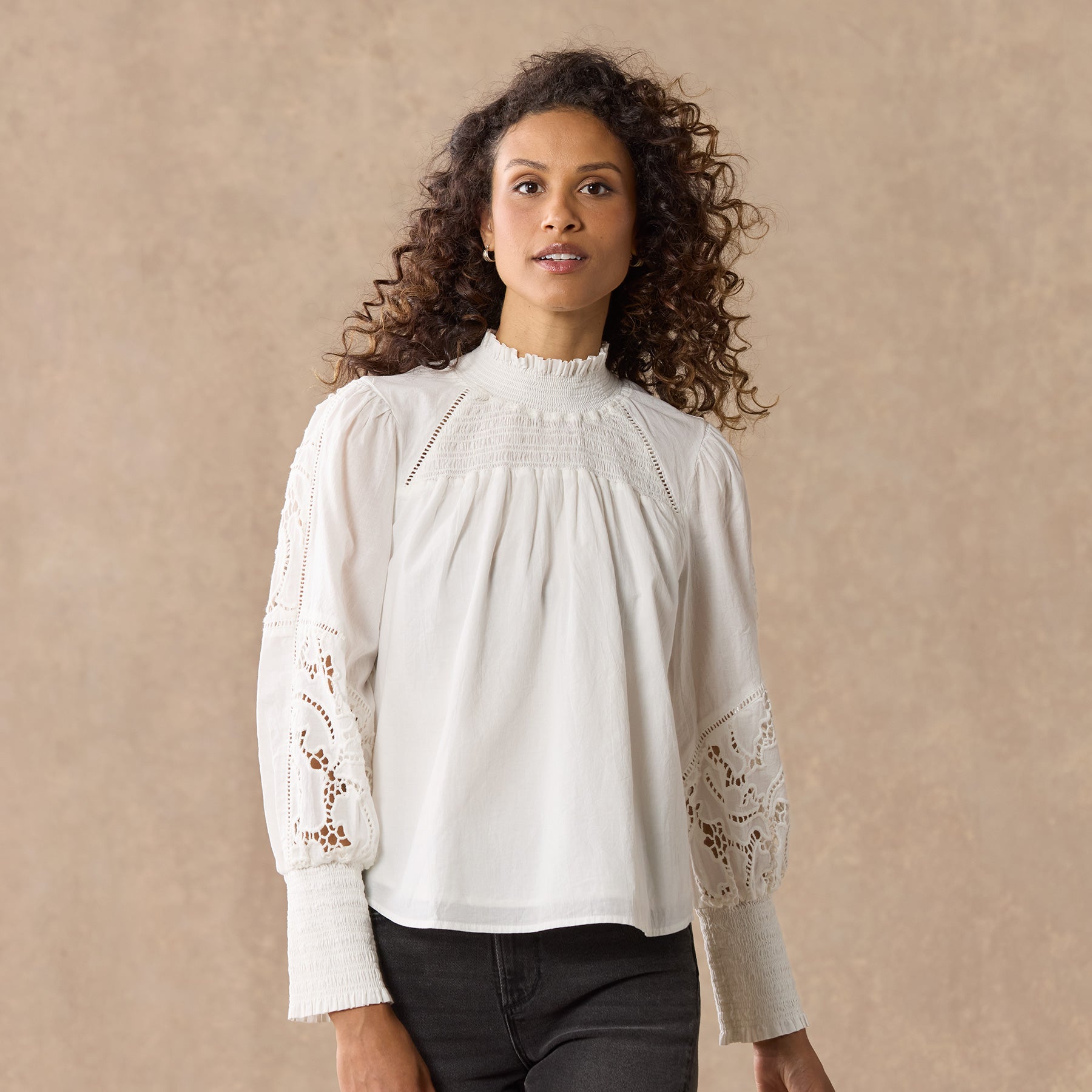 This ultra-feminine silhouette features smocking at the yoke and cuffs. ladder lace. lace insets and a ruffle at the neck. Cotton. Hand wash. Imported. Sizes XS (0–2). S (4–6). M (8–10). L (12–14). XL (16–18). Approx. 23.25l.